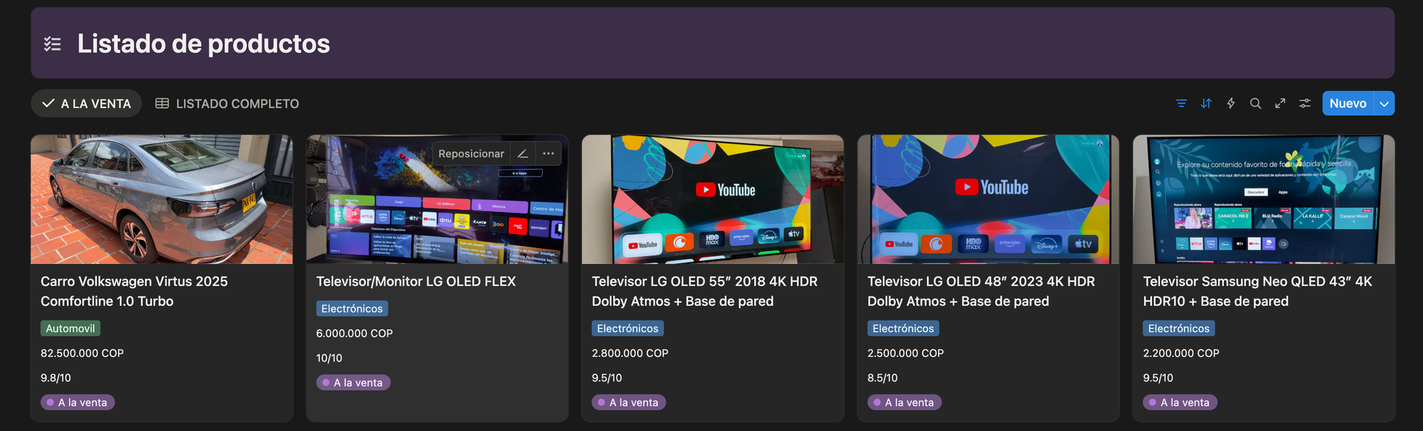 La página de productos fue diseñada en forma de galería para mostrar de forma visual todos los productos que están a la venta, y es la vista por defecto de la página de este Notion. Podrás ver antes de entrar a cada producto: